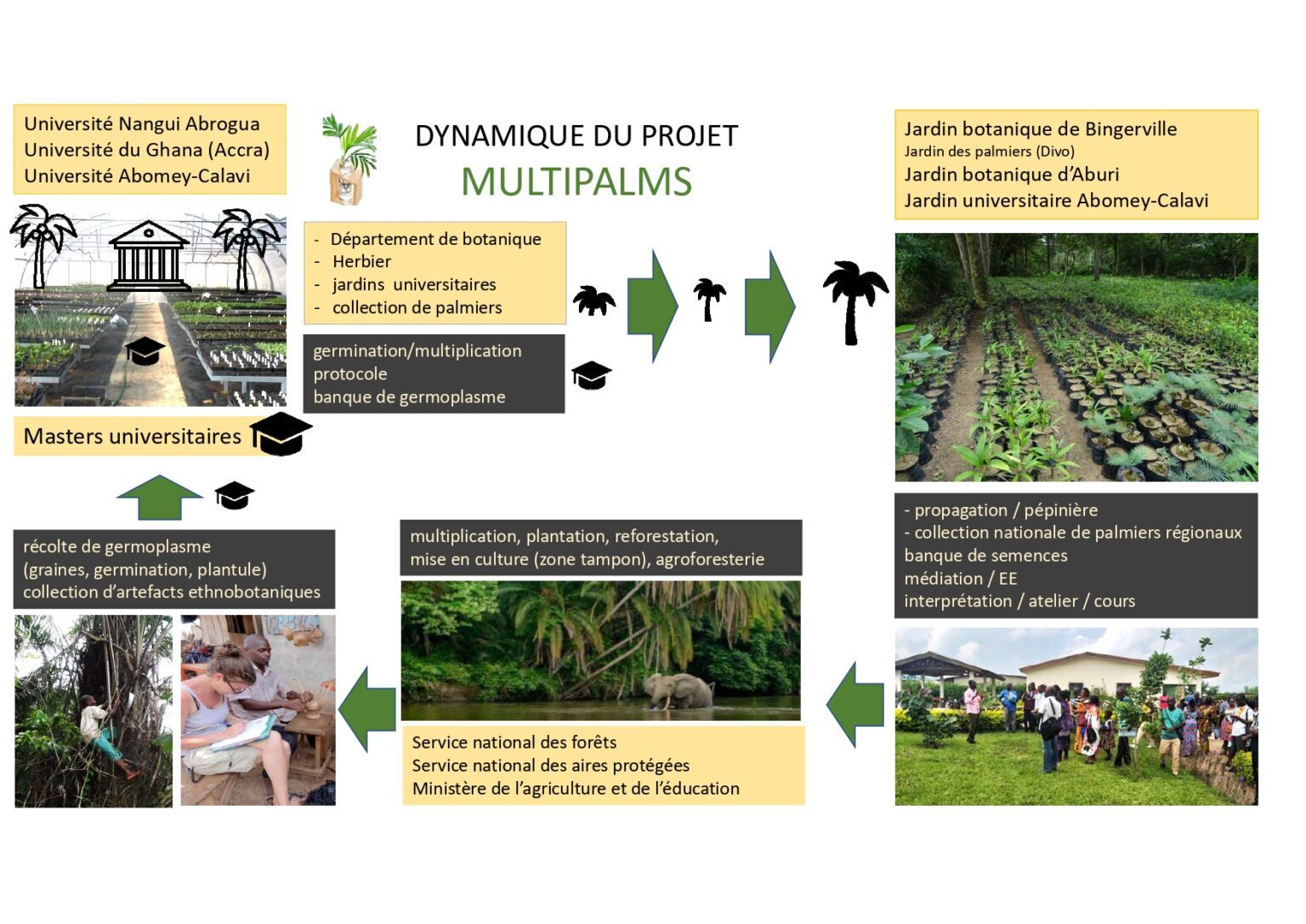 Le projet MULTIPALMS souhaite, à travers la connaissance des filières d’extraction des palmiers forestiers utiles (raphias, rotins et doums, entre autres), proposer des solutions agro-écologiques durables (multiplication, pépinières, domestication) pour la conservation active de ces espèces. A terme, ce projet vise à mettre à la disposition des agriculteurs, des associations, des ONGs, des jardins botaniques, des services forestiers et des gestionnaires des parcs, réserves et forêts classées, des plants de palmiers pour leurs opérations d’aménagement, d’agroforesterie, de réhabilitation des espaces dégradés et d’éducation environnementale. En outre, le projet MULTIPALMS accorde une place importante à la formation des jeunes pour la relève scientifique. Ainsi, sur les trois ans initiaux (2021-2024) que durera ce projet, au moins 5 étudiants de Master seront formés.